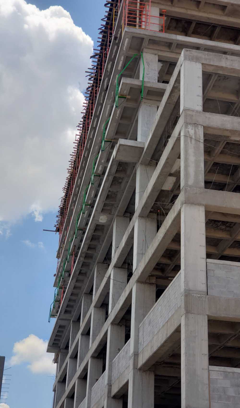 Ya con el perímetro cubierto con los brazos se empezó a trabajar con la red, la colocamos en secciones de 36 m. cada una, en esta parte se les explicó detalladamente como llevar a cabo la correcta distribución de la red para que abra el ancho que debe abrir, se sujetó a los brazos y se empalmó en los lugares correspondientes. Una vez con la red instalada sólo nos permitieron desplegar los brazos en 2 caras de la obra porque en la otras 2 la torre grúa estaba haciendo maniobras. Terminamos aclarando dudas, resaltando puntos clave y nos retiramos de la obra con el Sistema T colocado y el personal entrenado para realizar las elevaciones siguientes de forma autónoma.