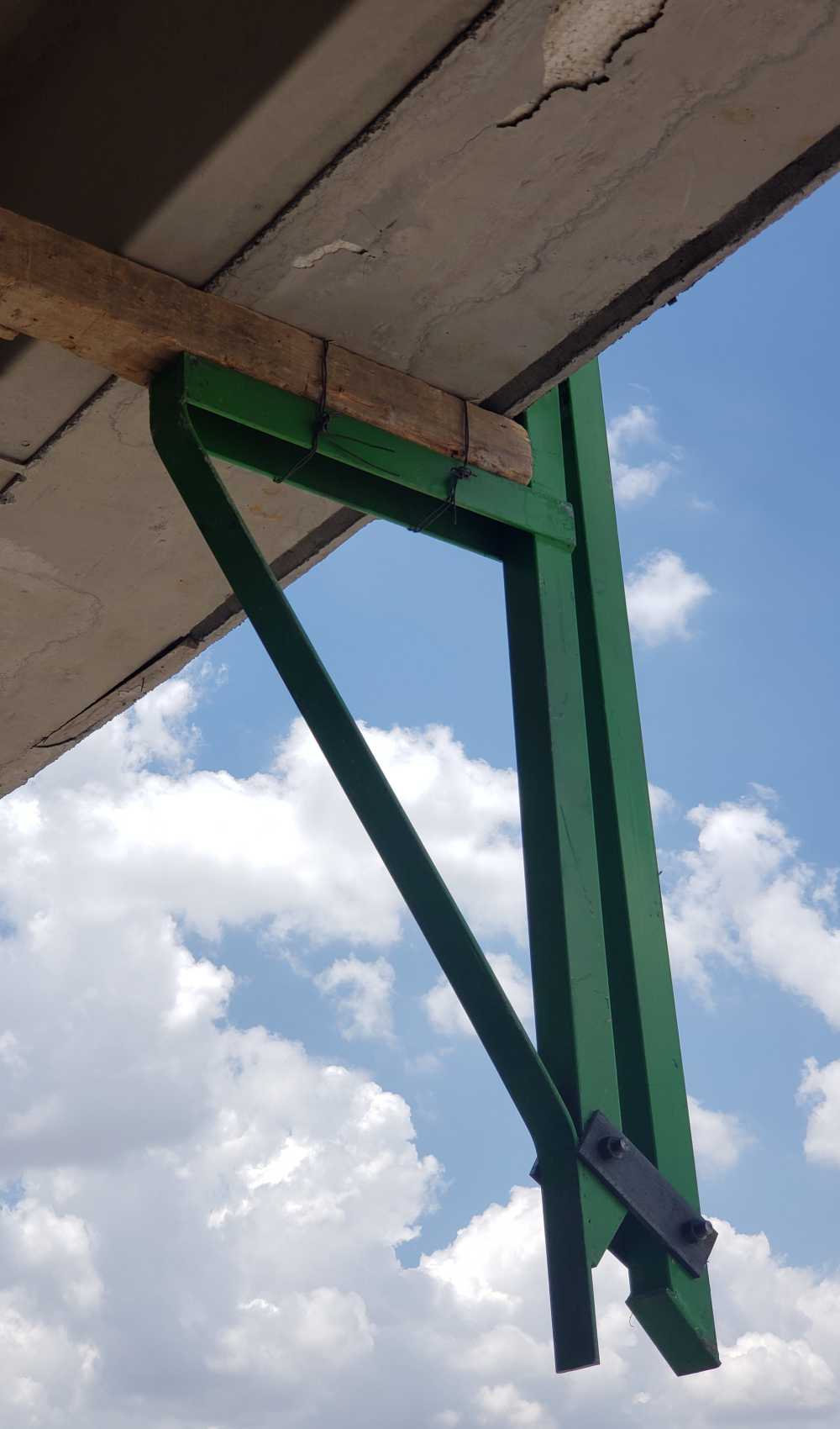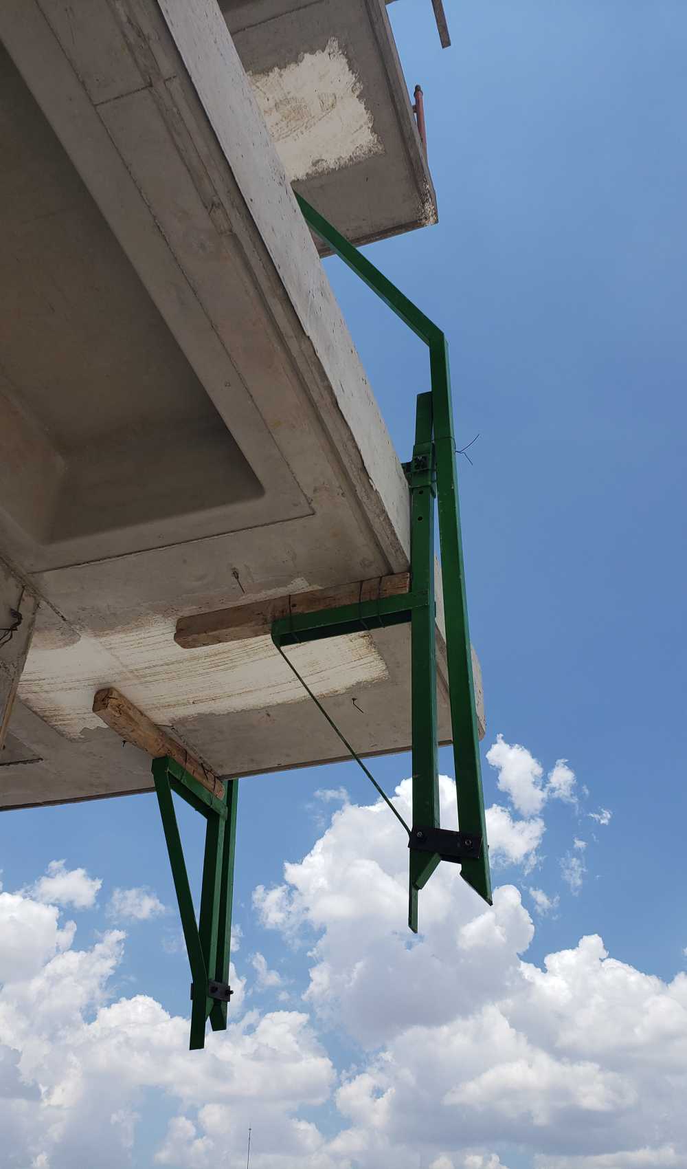 Ya con el material arriba empezamos mostrando la forma en la que los brazos se montan en la losa, y de uno en uno se fueron montando en todo el perímetro. El brazo tiene en la parte de en medio una mordaza que en conjunto con la base de sujeción hace una prensa y “muerde” la losa, este espacio donde entra la losa es determinado por la altura de la mordaza y a veces es necesario hacer ajustes para lograr que el brazo prense bien, estos ajustes son perforaciones, polines debajo de la manivela o polines en la parte baja de la base dependiendo de las condiciones en las que se presente el caso, de esta forma se logra que el brazo no tenga movimiento.