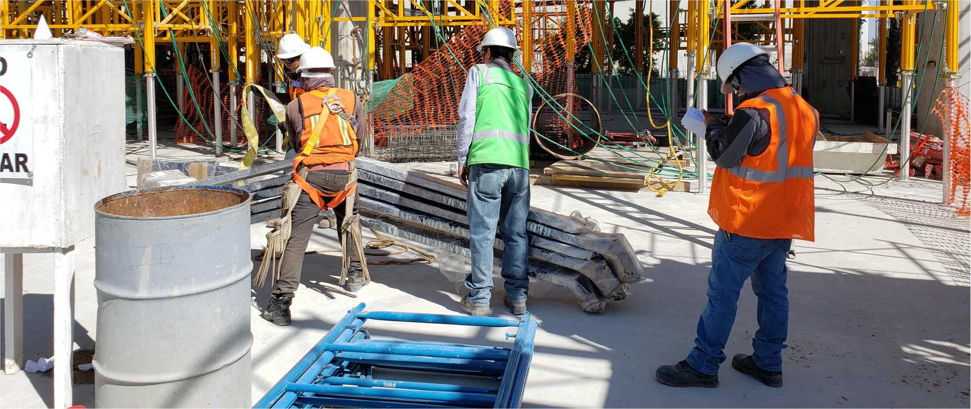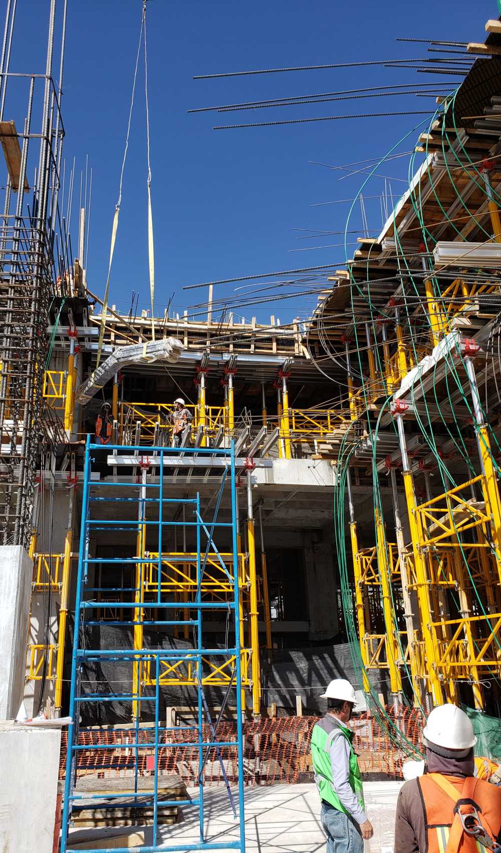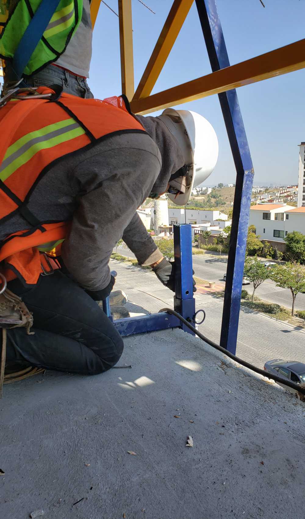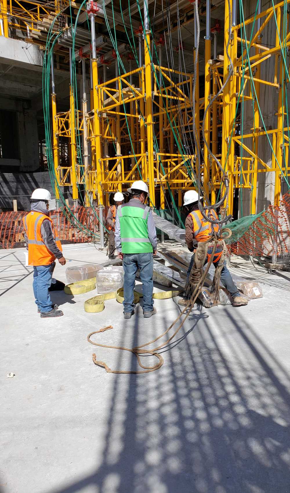 Me presenté a la obra para dar inicio a la capacitación, el personal ya estaba listo pero el material estaba en los niveles de abajo, con ayuda de la grúa se empezó a subir el material y empezamos el armado, rápidamente con las herramientas se armaron los brazos de una cara de la obra y procedimos a la instalación, de uno a uno los fuimos instalando y el proceso fue muy rápido ya que la losa era lisa y la mordaza entraba muy fácil.
