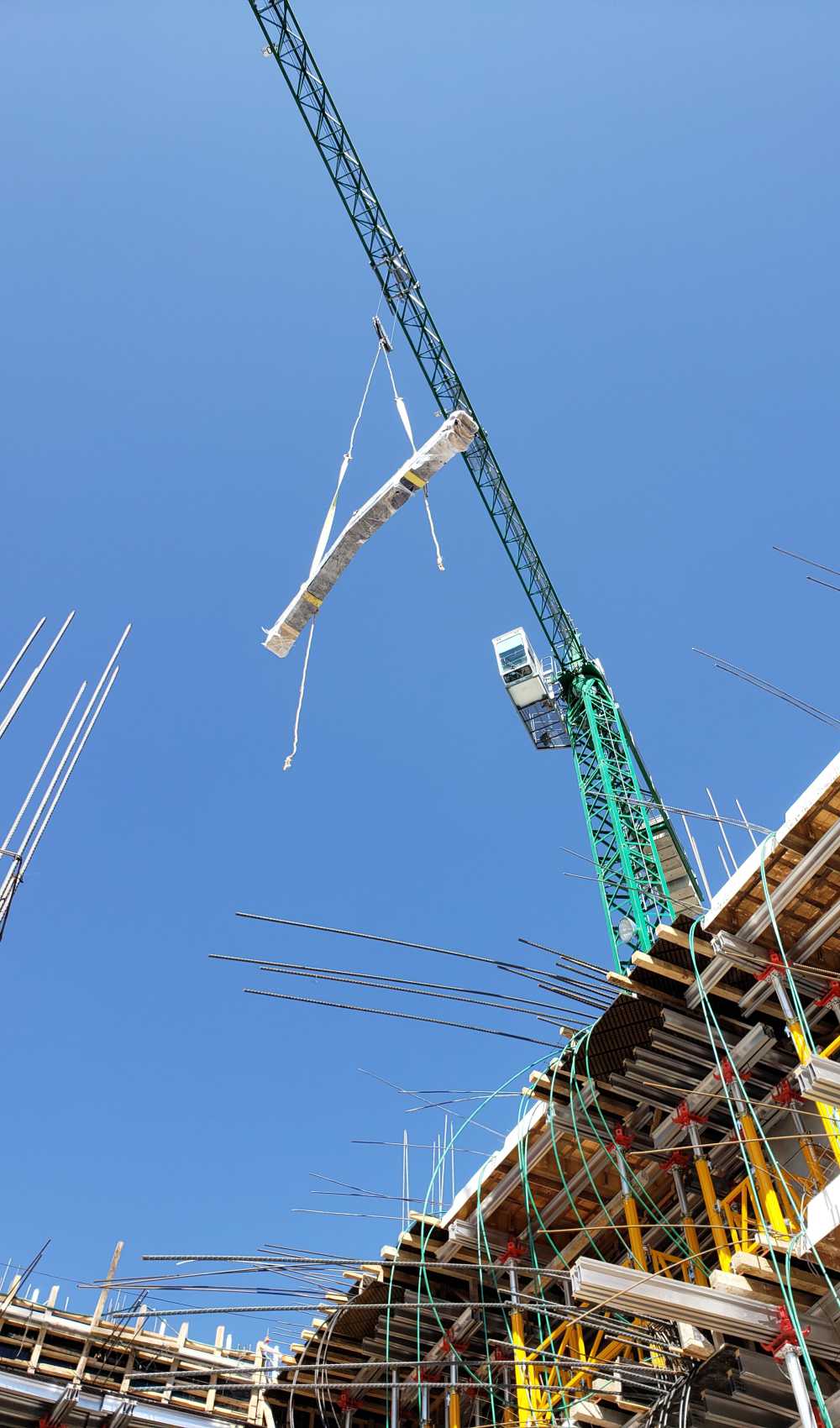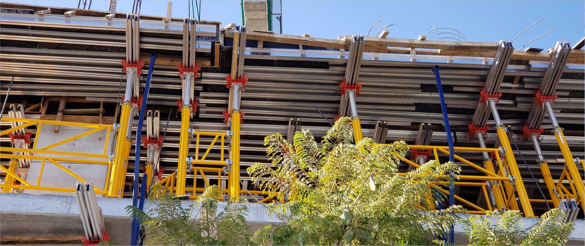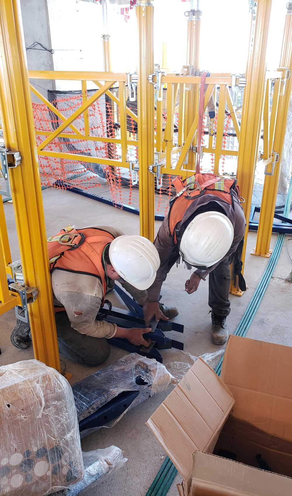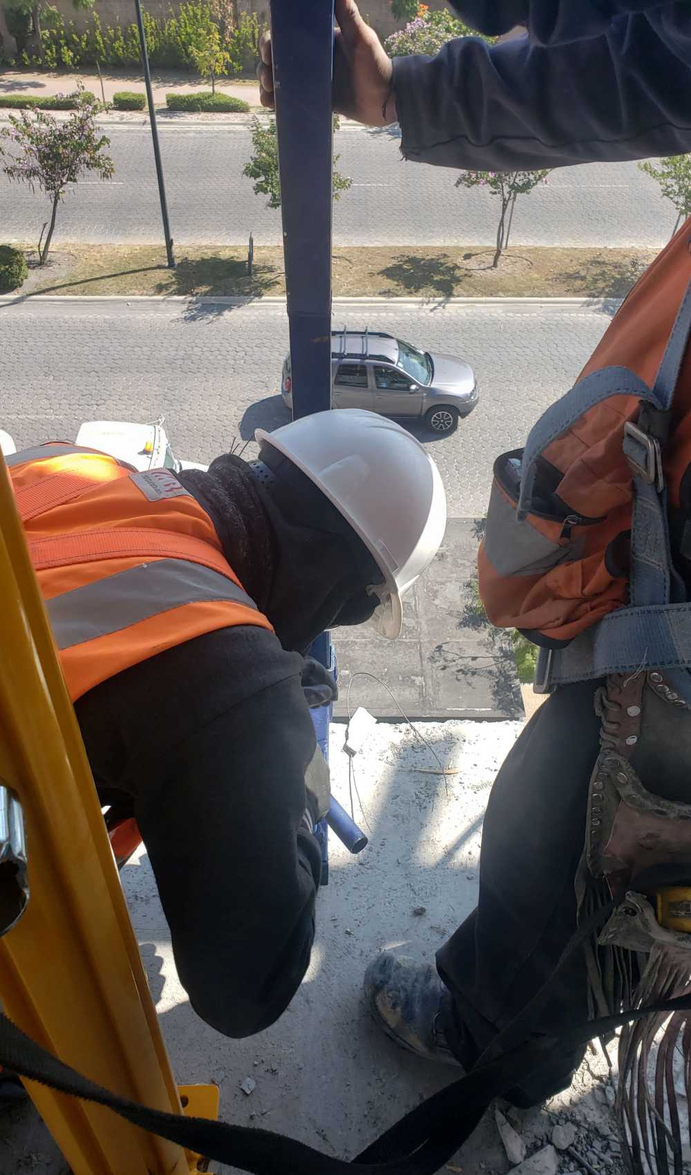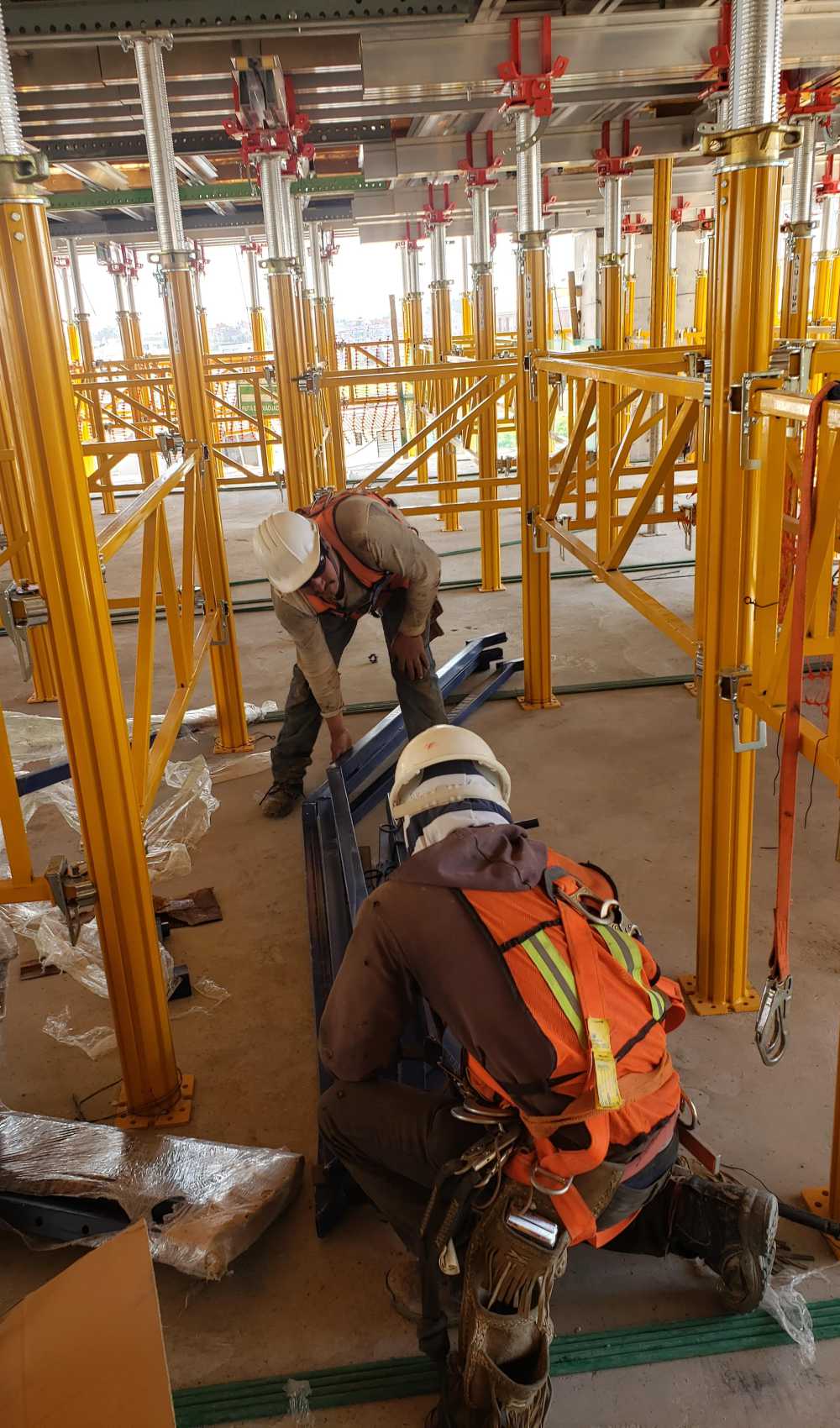 Me presenté a la obra para dar inicio a la capacitación, el personal ya estaba listo pero el material estaba en los niveles de abajo, con ayuda de la grúa se empezó a subir el material y empezamos el armado, rápidamente con las herramientas se armaron los brazos de una cara de la obra y procedimos a la instalación, de uno a uno los fuimos instalando y el proceso fue muy rápido ya que la losa era lisa y la mordaza entraba muy fácil.