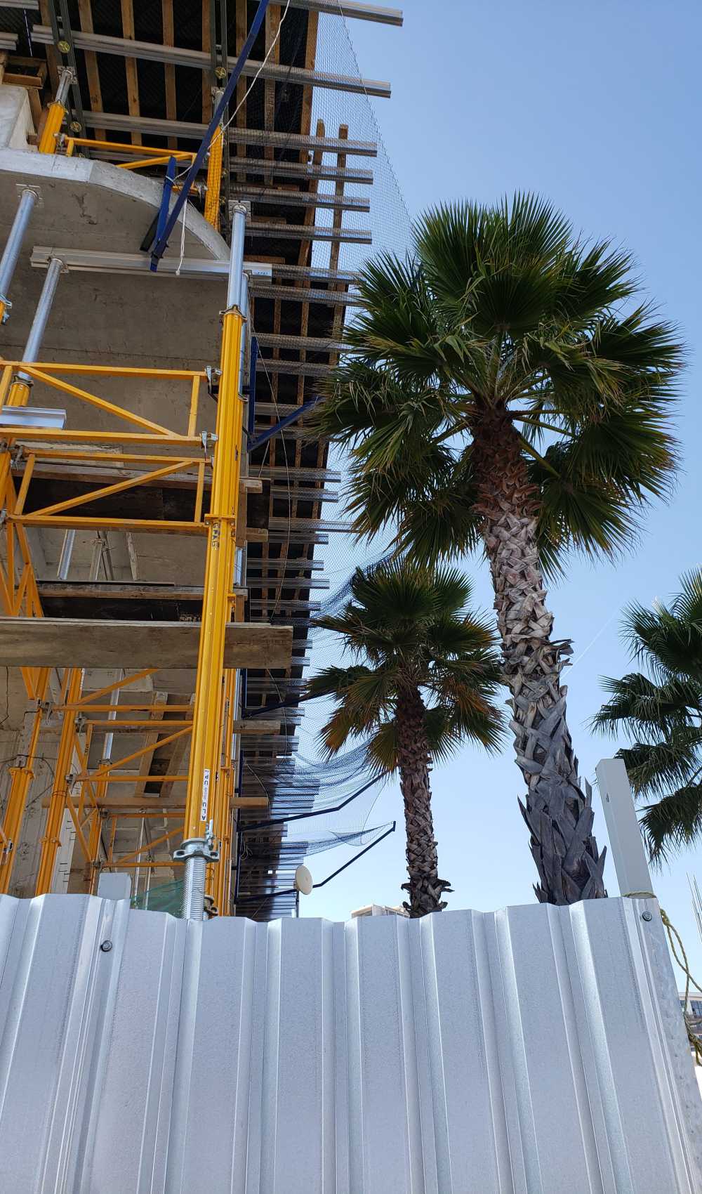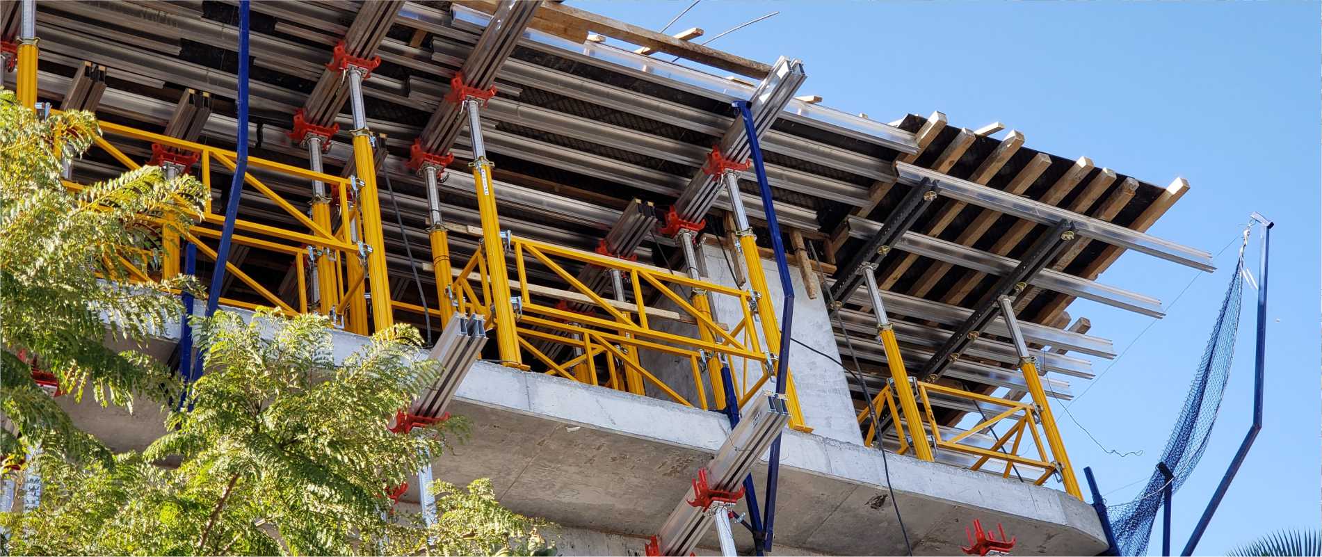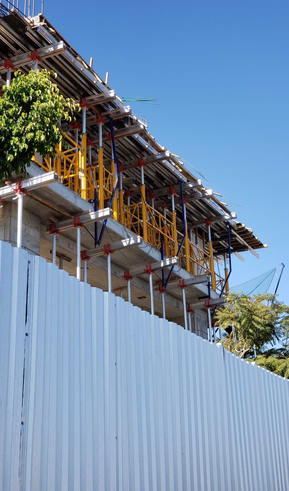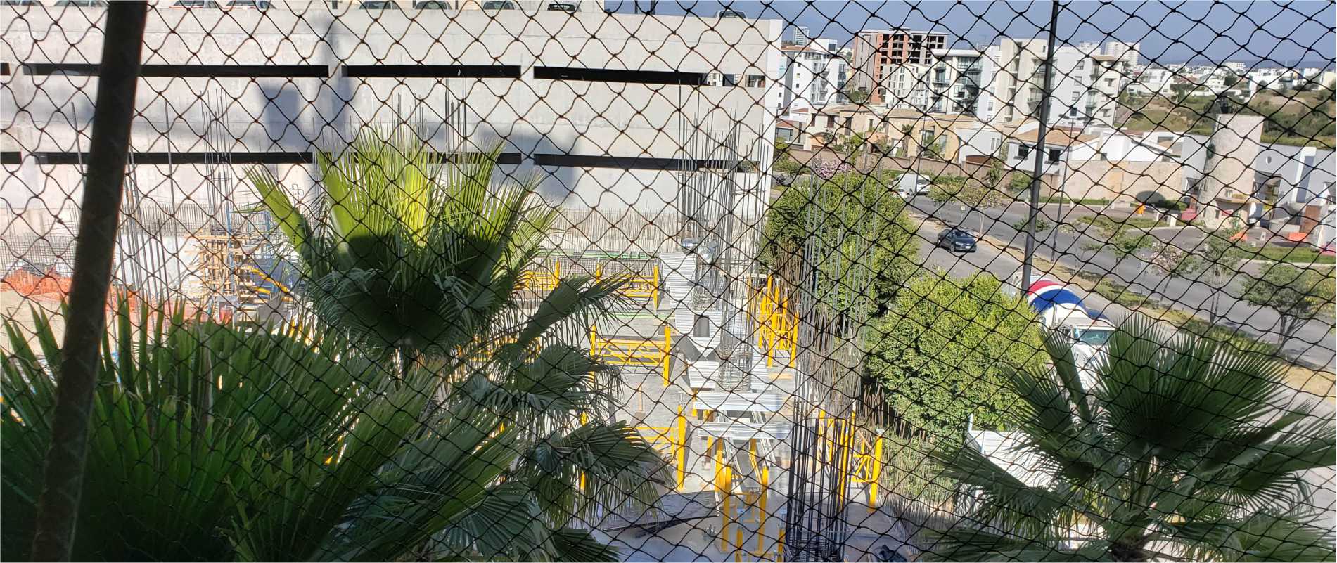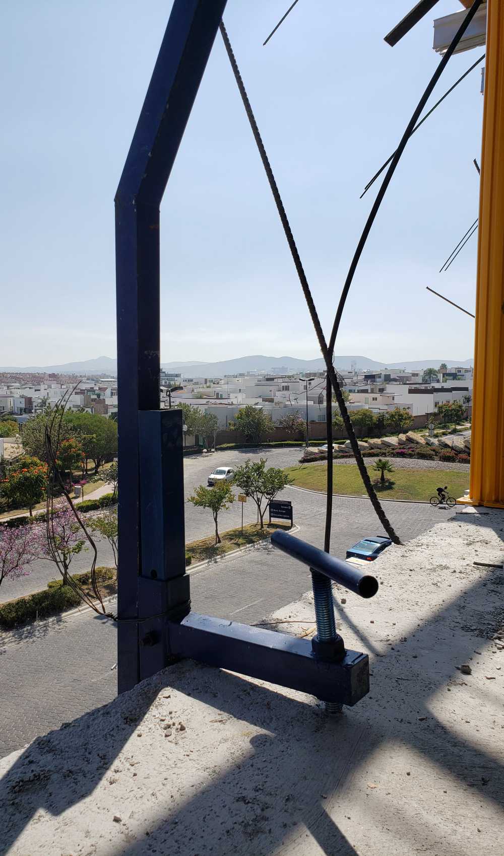 Instalación de mallas anticaídas en puebla, proyecto edificio Faurencia, método de instalación sistema T, brazos articulados desplegados al exterior de la obra.