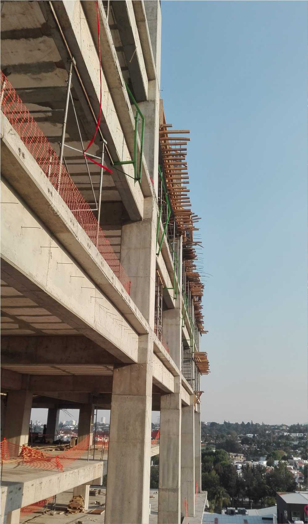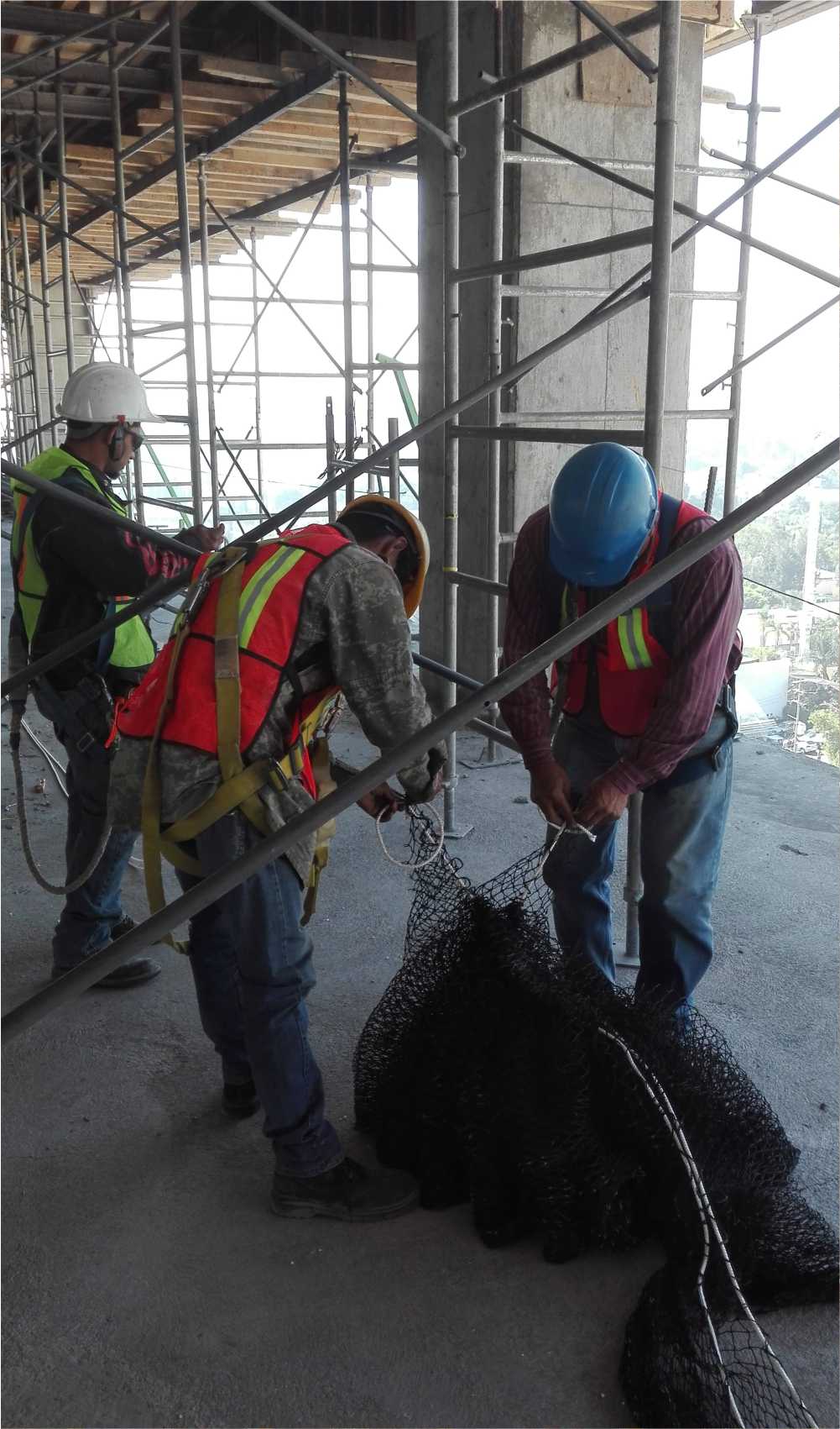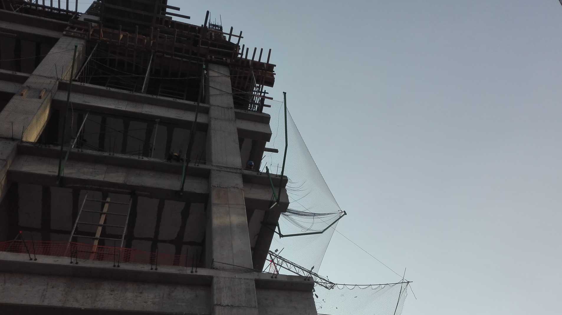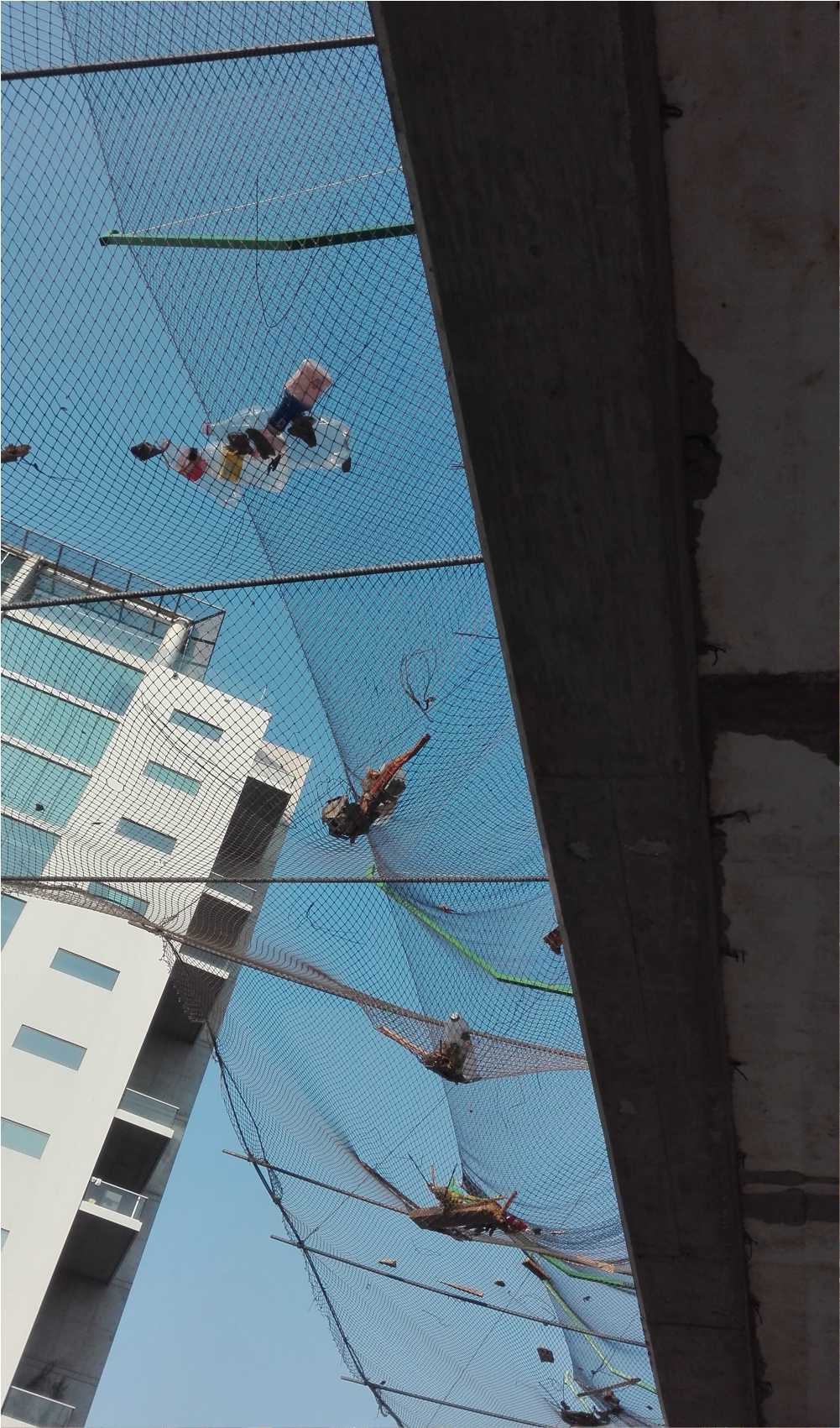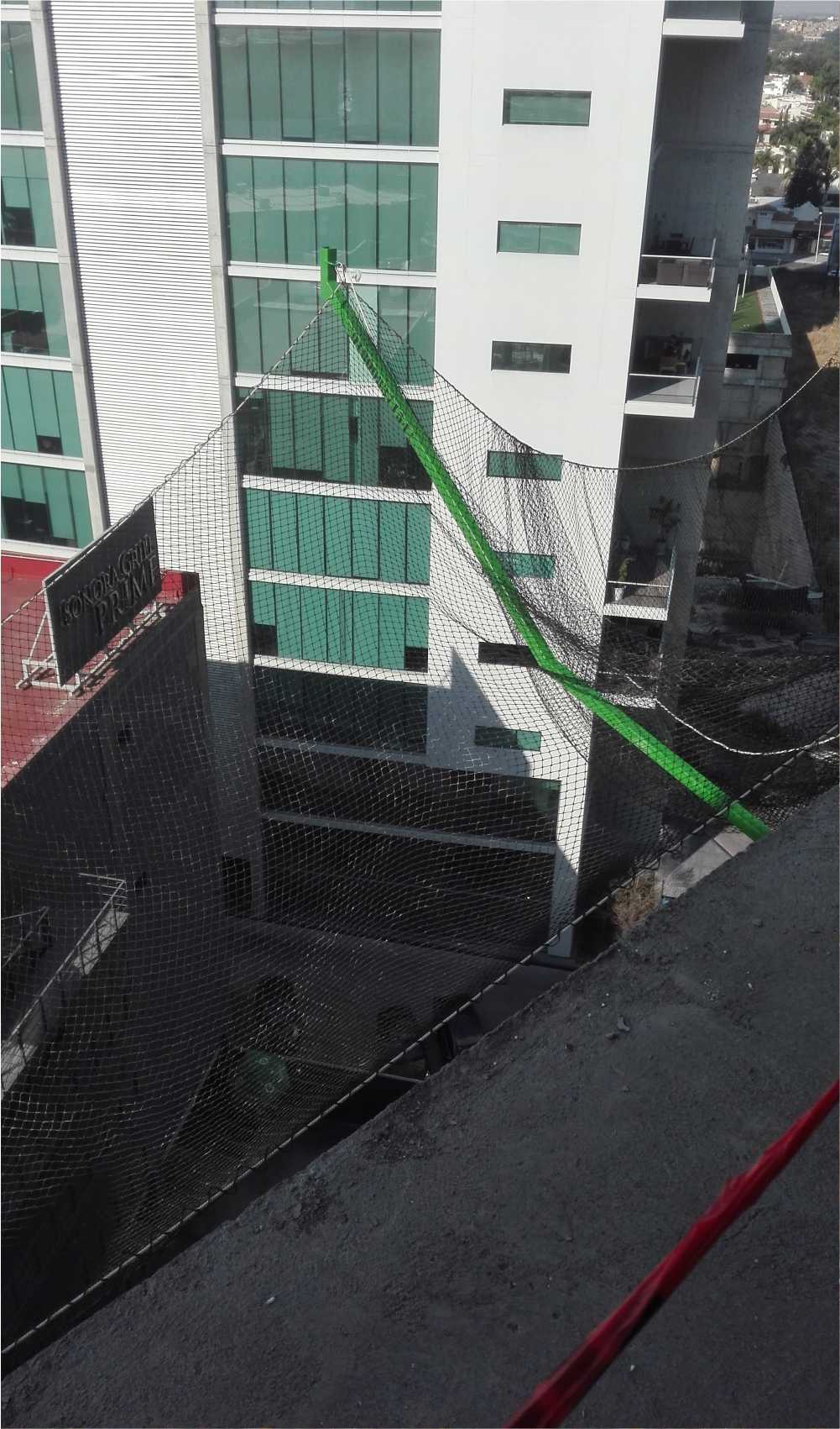 Debido a que las redes no se habían enviado completas nos pusimos a colocar la red que sobraba en la parte más importante en la cual había más urgencia por cubrir, por lo que los obreros midieron, seccionaron y cortaron la red para esa área, nos hacía falta mosquetones y personal de la Ing. Brenda me hizo el favor de ir a conseguirlos, se realizó la colocación de ese frente y en la esquina, llegando la red hasta el lado derecho.