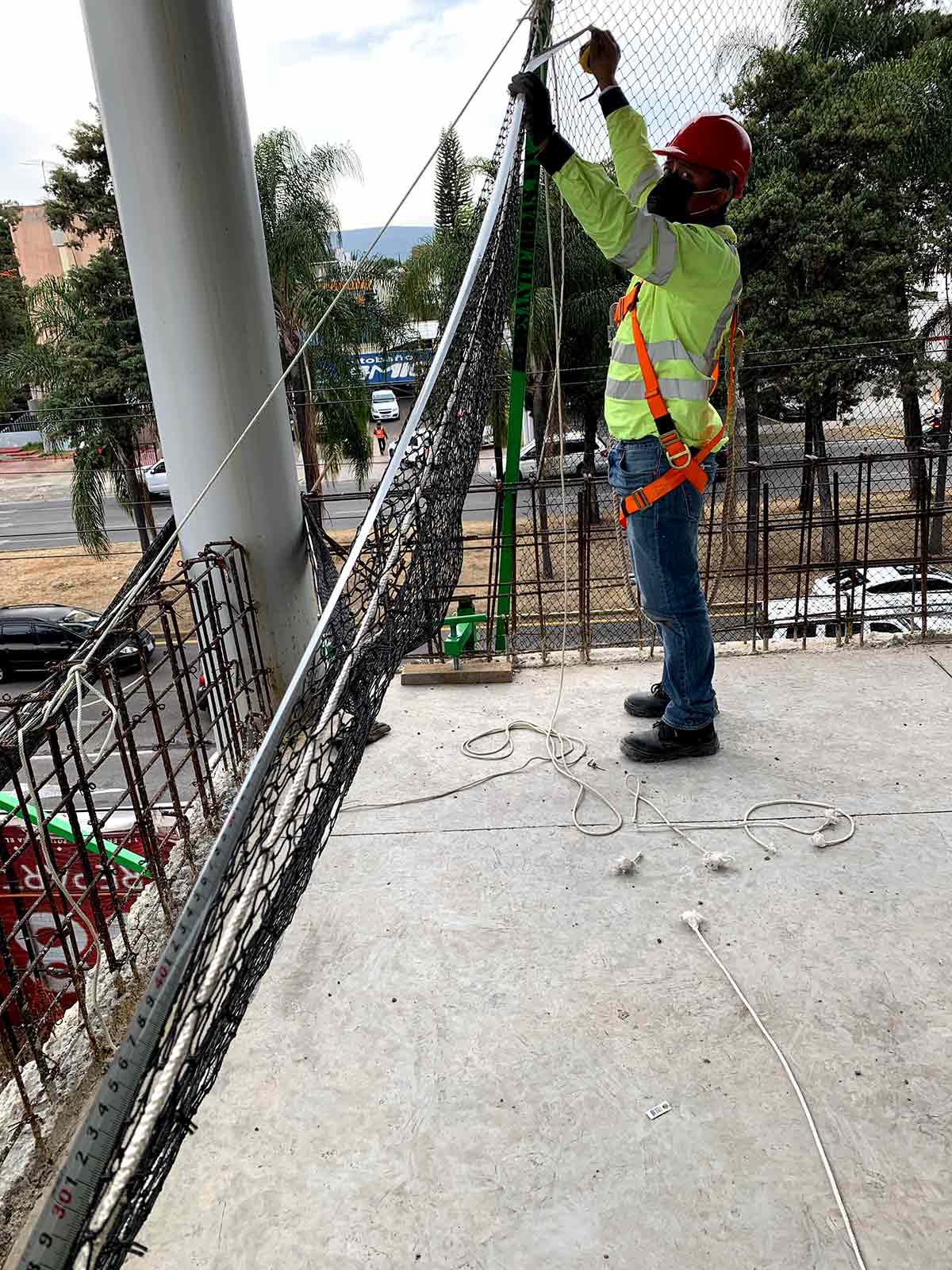 9:00 A.M. Me presenté a la obra para iniciar labores, llegó la segunda red y afortunadamente el personal ya estaba disponible para trabajar. Inicie explicándoles que debemos corroborar las medidas de la red, así como cuál es el comportamiento de la red al estirarla, cómo la debían colocar en la parte de arriba, etc.