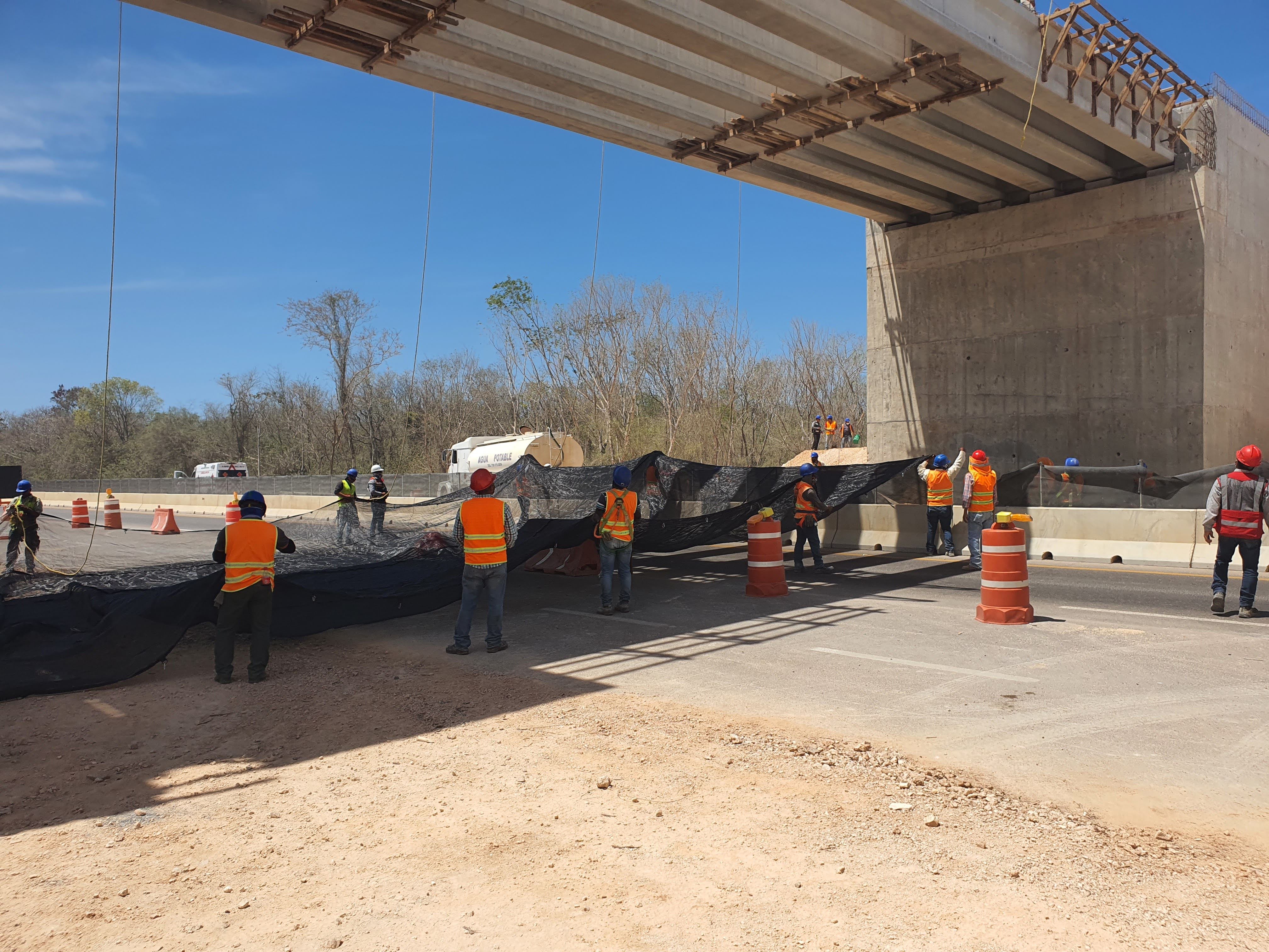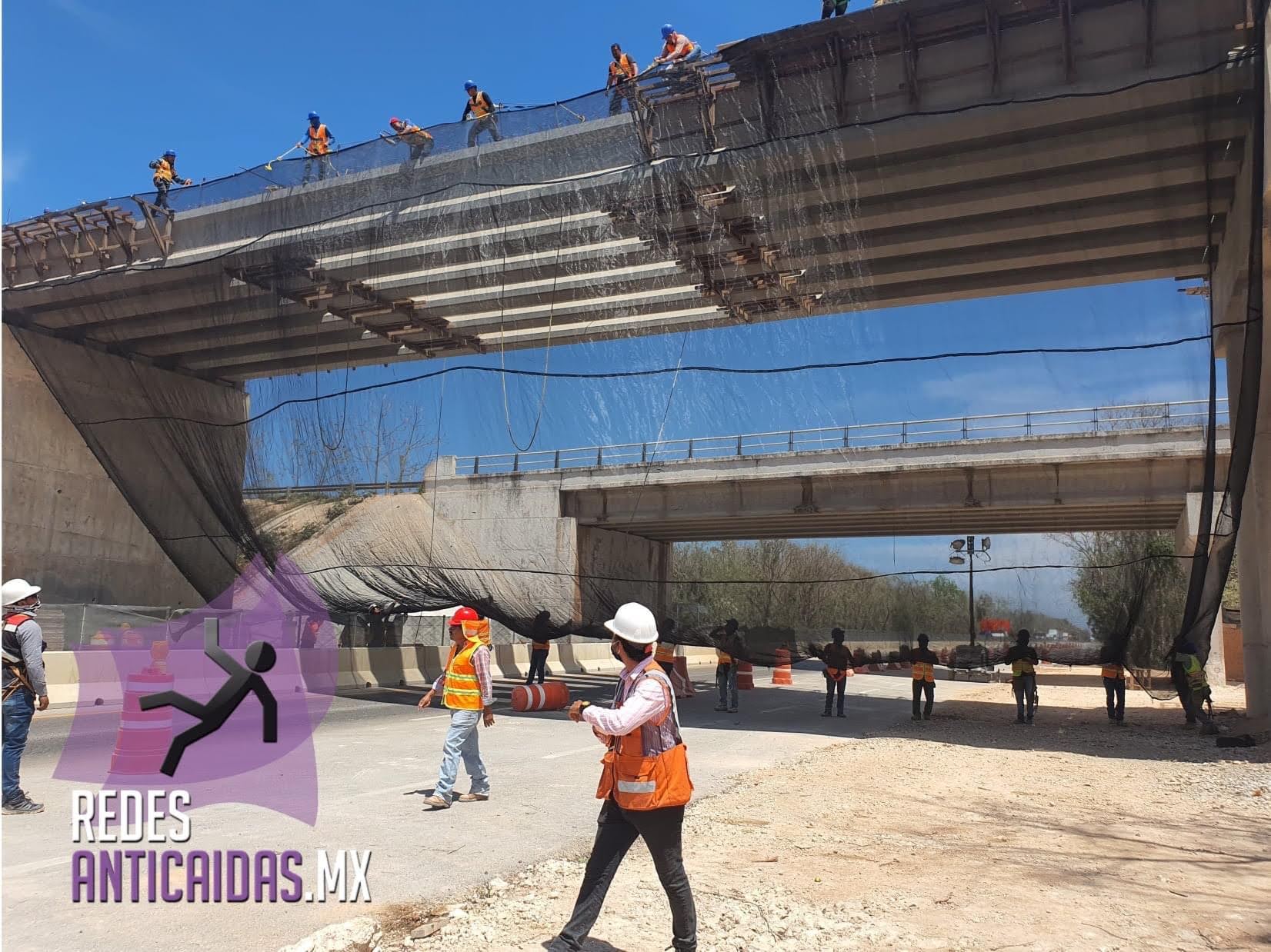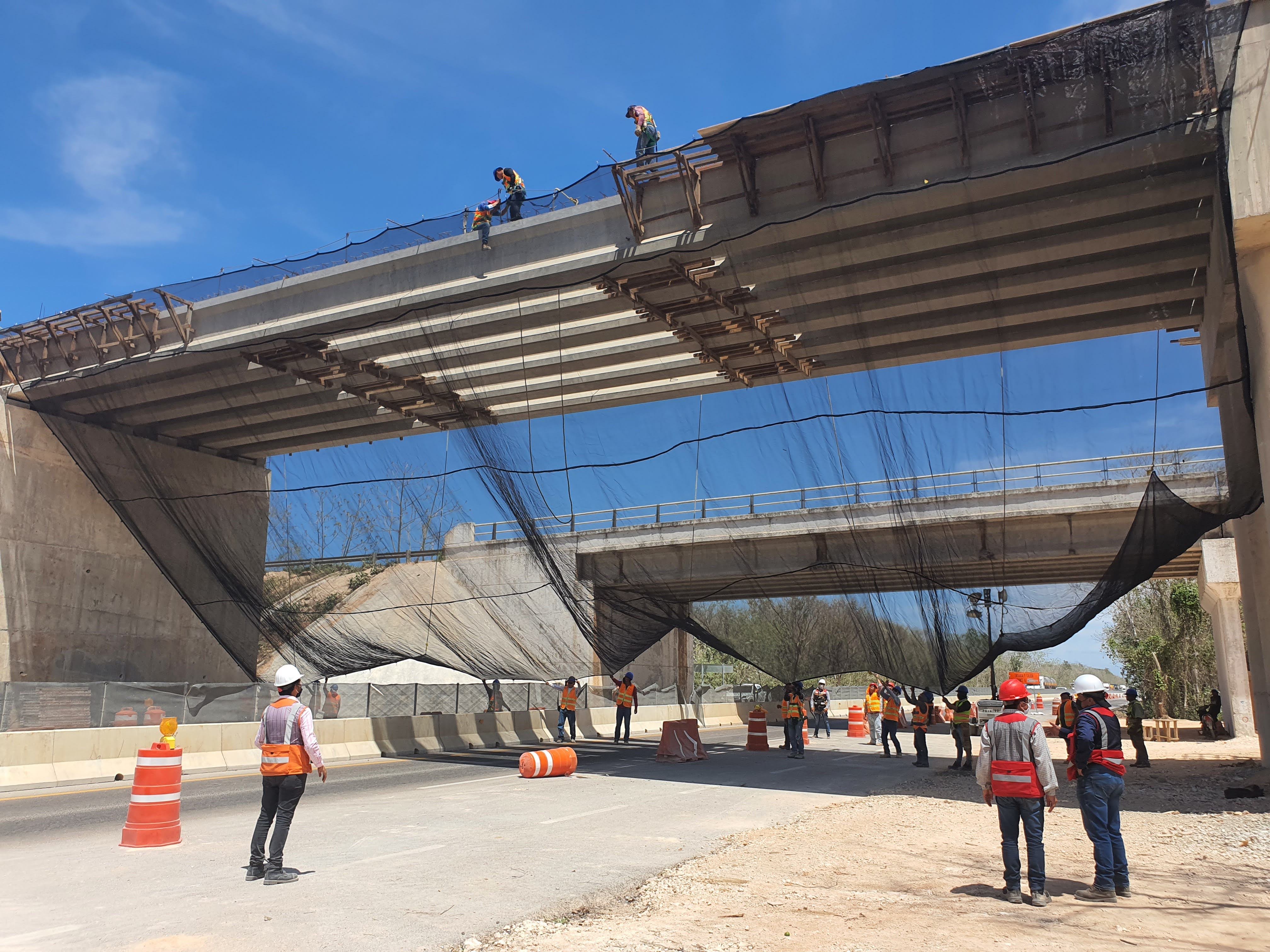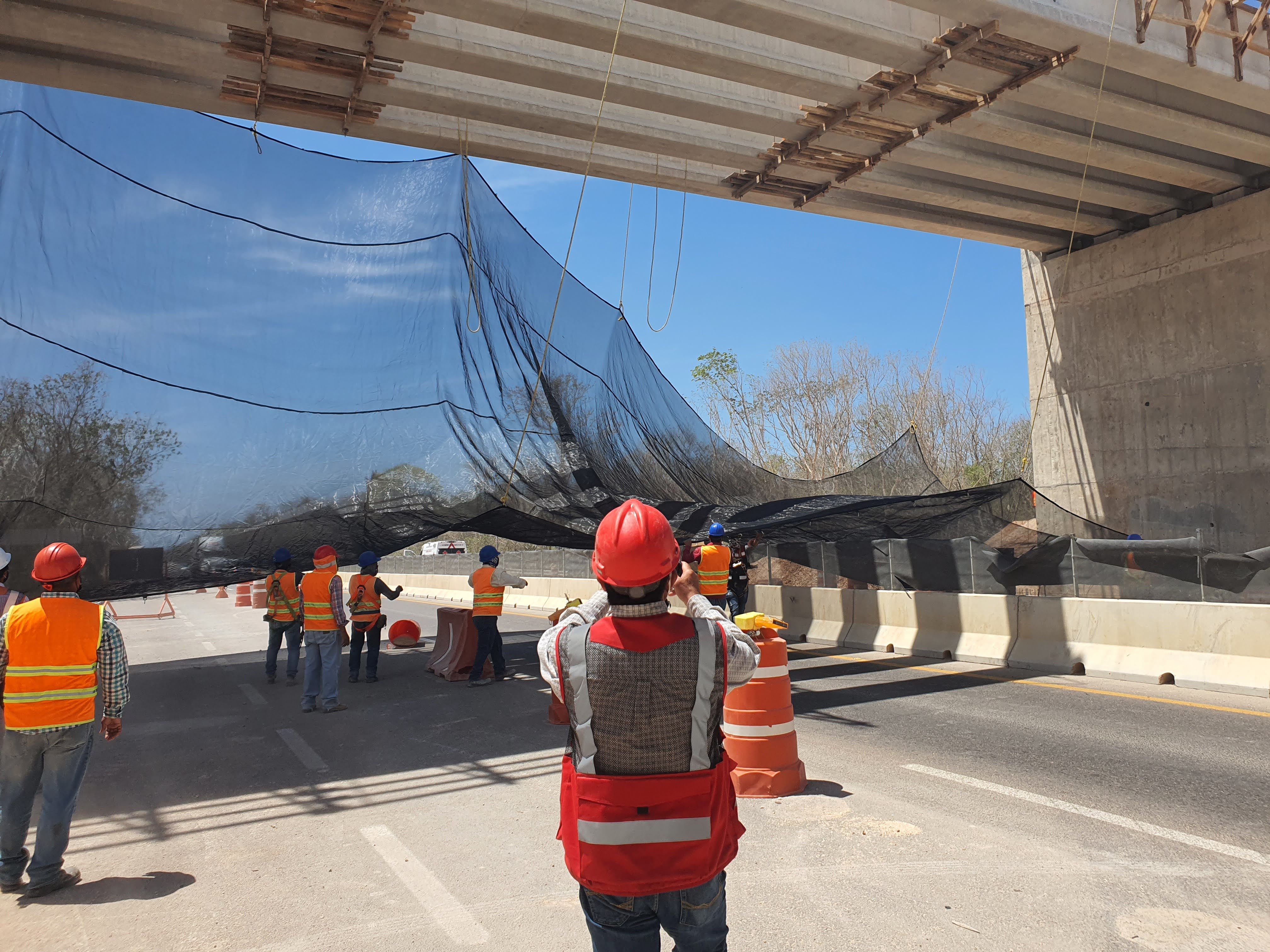 Se generó un entorno de trabajo seguro en la zona de maniobra del Tren Maya. El sistema permitió continuar labores sobre el tablero mientras el tránsito vehicular y personal trabajaba con protección total en el nivel inferior. Esta instalación demostró la efectividad de las redes anticaídas de tipo S como solución práctica y reutilizable para obras de infraestructura pesada.