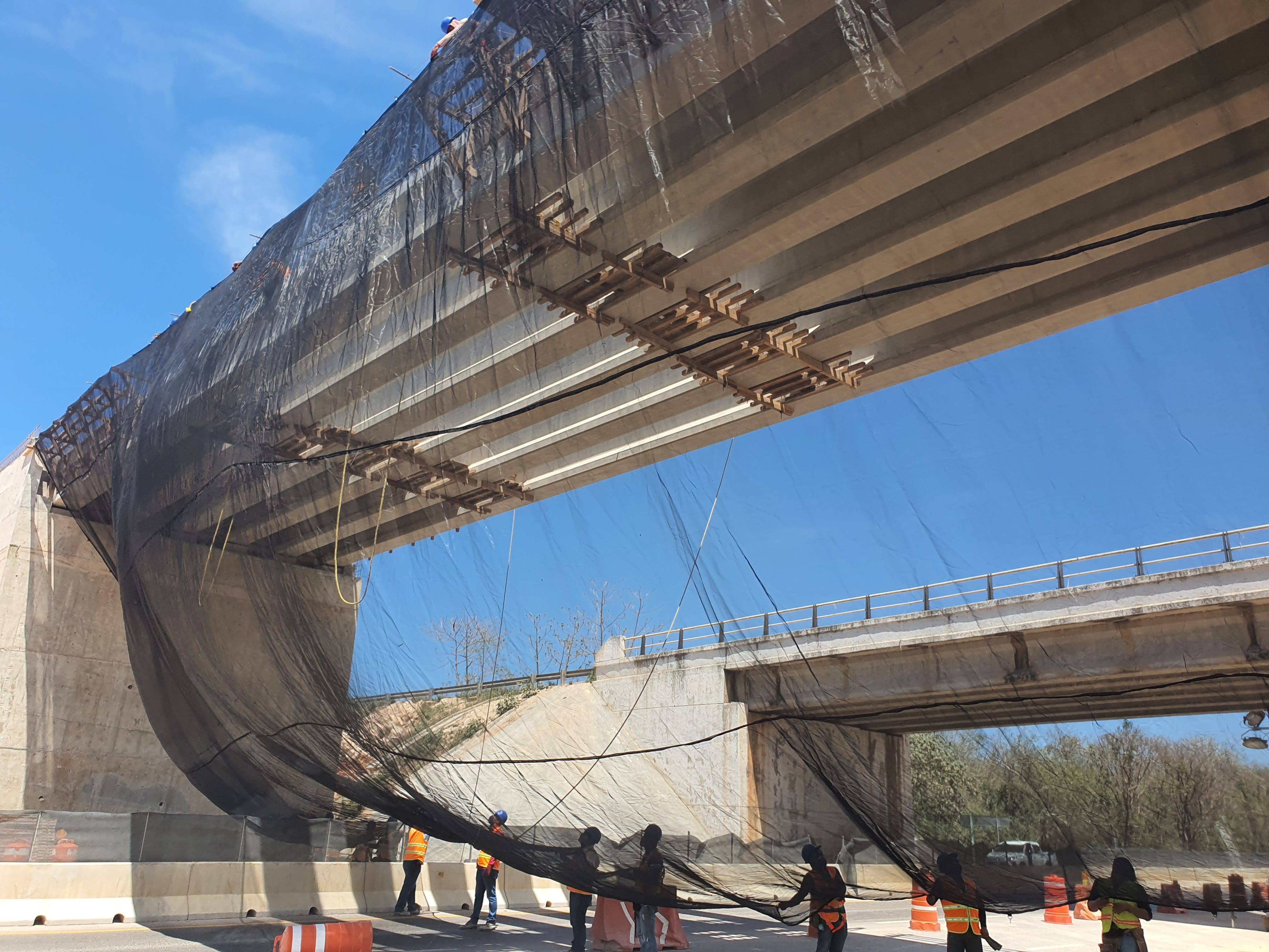 El Sistema S es una red de seguridad colectiva empleada para proteger a los trabajadores y peatones contra caídas de objetos o personas desde zonas elevadas. En este proyecto se instaló bajo las trabes del puente, cubriendo todo el claro de trabajo donde se realizaban maniobras estructurales.